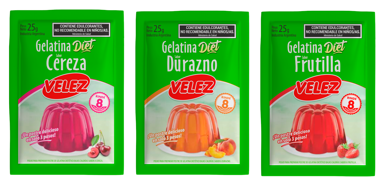La línea de Gelatinas Velez x 100 gr ofrece seis sabores diferentes: frutilla,