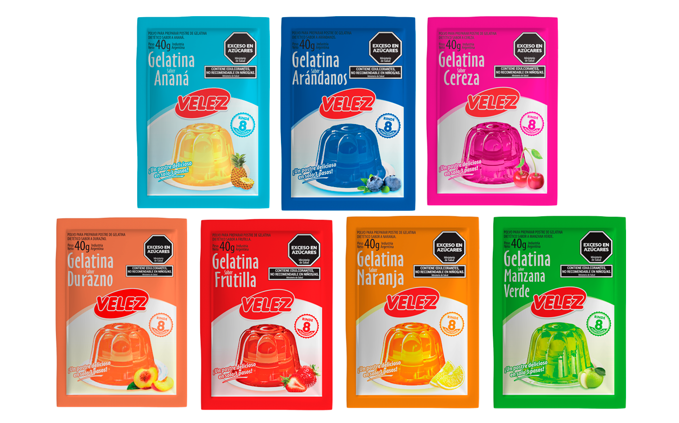 La línea de Gelatinas Velez x 40 gr en sobres ofrece seis sabores diferentes: ananá,